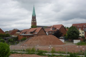 Ziel heute ist Wittenberge. Es ist Sonntag und da darf man es nicht übertreiben. Im Internet fand ich den Stadtgrundriß der Altstadt so interessant: einen ovalen Grundriß mit Straßen wie die Zierbänder auf Ostereiern. Die Struktur ist vor Ort nur bedingt sichtbar, da immer wieder zwischen den Häusern eines oder mehrere fehlen. Das Städtchen würde ich als die lückenhafte Stadt bezeichnen. Das Bild zeigt die Kirche durch eine Lücke. Bei vielen Giebelseiten ist das Fehlen des Nachbargebäudes sichtbar. Ein Straßenbild kommt so nicht zu Stande.