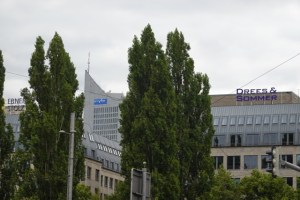 Beim Hauptbahnhof schaue ich in die Stadt und sehe gleich zwei Hauptattraktionen (siehe Bild). Da ich das MDR-Hochhaus schon erwähnt habe, wende ich mich der anderen Attraktion zu und besuche meine ehemaligen Kollegen. Sie haben die richtige Idee und es geht noch ins Weinhaus. Danke dass ihr da wart und Entschuldigung bei den Angehörigen, die etwas länger warten mussten.