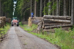 Da nicht alles Holz sofort verarbeitet werden kann, wird es am Rand über Kilometer aufgeschichtet und wohl auch regelmäßig behandelt, wahrscheinlich gegen Borkenkäferbefall. Die Dame, die das Mittel spritzt, hat einen Vollköperanzug und eine geschlossene Gesichtsmaske an und hört freundlicher Weise auf zu spritzen, als ich näher komme. Ich nehme nicht an, dass sie die Maske wegen Corona trägt.