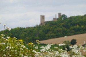 Dann also wieder auf die Landstraße und erst mal wieder die Autobahn A44 unterqueren, um nach Volkmarsen zu laufen. Über der Stadt thront die Burg, besser die Ruine der Kugelsburg. Beim Anmarsch sieht es zumindest malerisch aus. Dies ist wohl die Einkaufsstadt in der Gegend. Die Stadt hat einen mittelalterlichen Stadtkern, der jedoch einige Lücken aufweist. Einige Geschäfte sind wohl aufgegeben, auch die Apotheke, die überall eingezeichnet ist. Ich brauch mal wieder Pferdesalbe für meine schlanken Fesseln. Nach den Straßennamen um die Kirche und den Namen der Kirche St. Marien ist darauf zu schließen, dass ich in einer katholischen Gegend bin. Den Kirchentürentest kann ich nicht durchführen, da der Bereich wegen Bauarbeiten gesperrt ist.