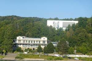 In Rolandseck auf der anderen Seite ist das arp-Museum genau im Blick (siehe Bild). Es besteht aus einem alten Teil im alten Bahnhof und einem Neubau von Richard Meier. Verbunden sind beide Teile durch einen nachgebauten Bahntunnel unter der zwischen den beiden Gebäuden durchführenden Bahntrasse. Leider hat das Museum um diese Zeit noch nicht offen. Das Austellungskonzept ist neben Hans Arp und Sophie Taeuber-Arp eher sehr gemischt. Die Bauwerke sind schon von außen spannend.