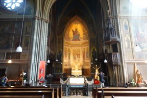 Endlich mal wieder ein richtiger Anstieg und dann oben durch den Wald. Es ist zwar schon warm, aber im Wald noch aushaltbar. Herunter komme ich in Remagen an der Appollinaris-Kirche, einen 1857 geweihten Bau mit vielen Malereien im Narazenischen Stil. Für mich wirkt die Kirche wie eine alte orthodoxe Kirche.