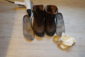 Ich wurde jetzt schon zweimal gefragt, ob die Schuhe so eine Wanderung durchhalten. Erst mal, die meisten Wanderschuhe geben ihren Geist nicht beim Wandern auf, sondern gehen im Keller kaputt. Sie lösen sich im wahrsten Sinne des Wortes auf, nicht die Schuhe, sondern die Sohlen. Durch die Feuchtigkeit und die fehlende Bewegung werden sie spröde. Meist nach einer längeren Pause geschieht dies bei der ersten Wanderung. Man hat die gesamte Sohle in der Hand. Die Schuhe selbst halten so eine Wanderung von ca. 3.000 km ohne Probleme aus. Am wichtigsten ist die Schuhe trocken zu halten. Die Innensohle kommt sofort raus. Entweder werden die Schuhe umgekehrt auf die Heizung gelegt oder ich „unterstütze“ den Vorgang auch mit dem Fön. So alle zwei Wochen werden sie von mir eingefettet. Das Mittel in kleiner Portion trage ich mit. Als „Lappen“ zum Auftragen dient mir eine Serviette aus gutem Hause (festere Qualität). Ich habe auch schon Toilettenpapier und Schminkpats (sehr schlecht geeignet) probiert. Die Sohle ist nach 1.500 km ein noch nicht blank und hat noch genügend Profil. Die werden auch noch die 3.000 km aushalten. Der Rest hängt vom persönlichen Laufstil ab. Meist werden die „Absätze“ ungleichmäßig abgelaufen. Da hilft nur durch mit den gleichen Schuhen Durchlaufen und nachher neu besohlen lassen. Es wird dann die gesamte Sohle mit Dämpfung ausgetauscht. Dann kann die nächste Fernwanderung erfolgen. Also zwei Wochen Pause dazwischen sind obligatorisch und kein Anzeichen von Schwäche!