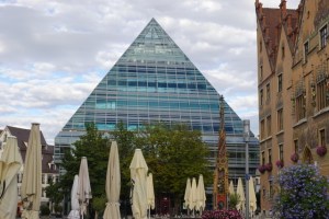 Das historische Rathaus ist aufwändig mit Fresken bemalt und eine der Hauptattraktionen von Ulm. Gleich daneben wurde eine neue Stadtbibliothek als gläserne Pyramide (siehe Bild) nach den Plänen von Gottfried Böhm errichtet. Das Bauwerk sieht neben dem historischen Rathaus gut aus und stört mich nicht. Sein Kommentar: was soll der Glasscheiß neben dem Rathaus. Mein Problem wäre eher Glas, Sonne und Bücher.