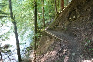 Der Weg führt nun steil bergab und ich gehe weiter zur Ammerschlucht. Diese ist nur an wenigen Stellen begehbar. Der Weg ist doch anspruchsvoll und es wird zurecht auf festes Schuhwerk hingewiesen. Auf einem kleinen Pfad geht es auf und ab, über Wurzeln, durch umgefallene Bäume, über Treppen und Stege und auch mal durchs flache Wasser. Jeder Meter ist hier doppelt so anstrengend wie auf einer freien Strecke. Wenn jemand entgegen kommt, muss einer ausweichen. Trotz der Anstrengung isdie Schlucht ein schönes Erlebnis, wenn man richtig ausgerüstet ist. Ein Paar überhole ich, welches doch sehr vorsichtig läuft. Sie hat feste Turnschuhe an, aber die Spuren eines Sturzes sind auf der Hose durch Schlammspuren im oberen Bereich deutlich ablesbar.